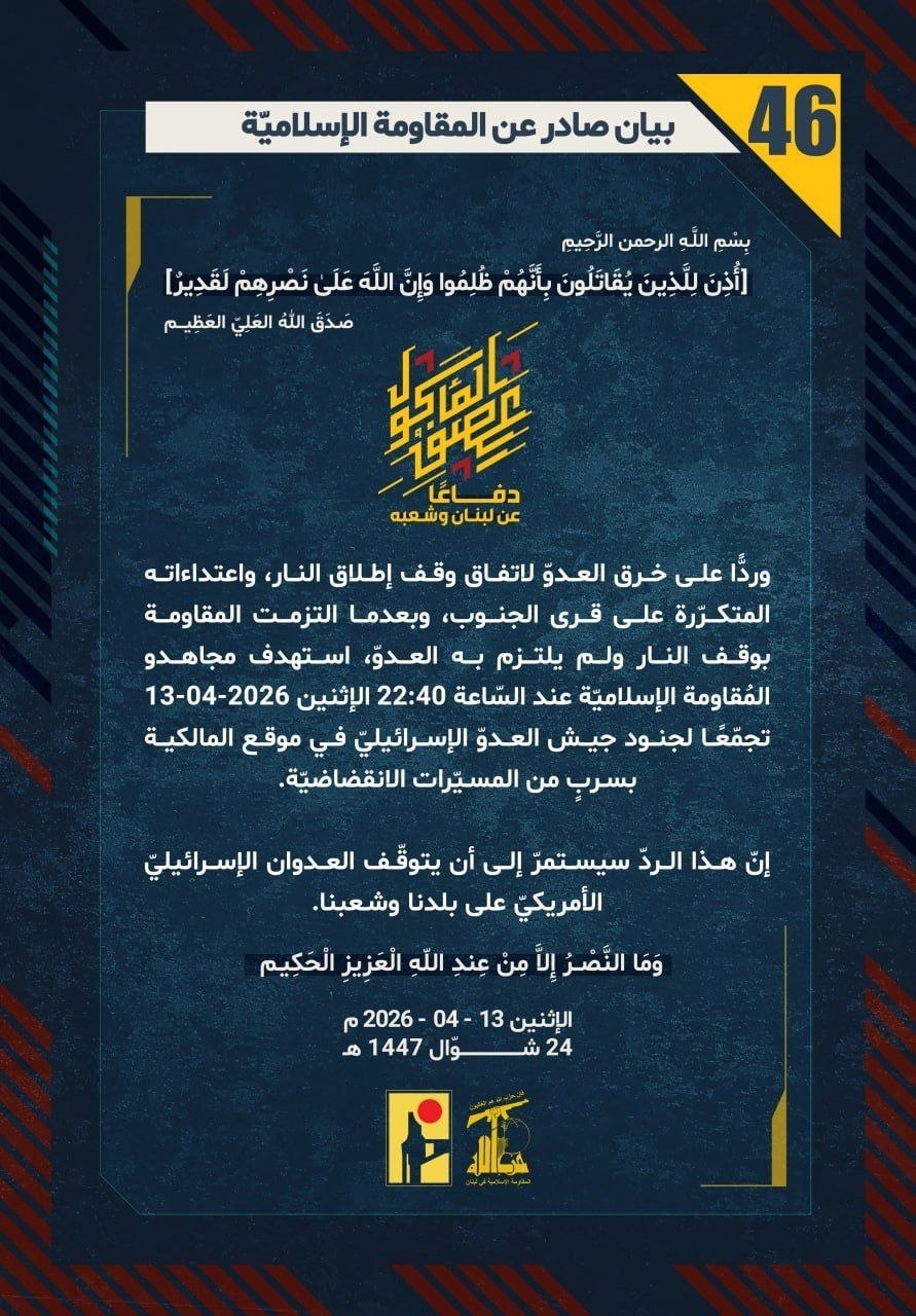 دفاعًا عن لبنان وشعبه، وردًّا على خرق العدوّ لاتفاق وقف إطلاق النار، واعتداءاته المتكرّرة على قرى الجنوب، وبعدما التزمت المقاومة بوقف النار ولم يلتزم به العدوّ، استهدف مجاهدو المُقاومة الإسلاميّة عند السّاعة 22:40 الإثنين 13-04-2026 تجمّعًا لجنود جيش العدوّ الإسرائيليّ في موقع المالكية بسربٍ من المسيّرات الانقضاضيّة.