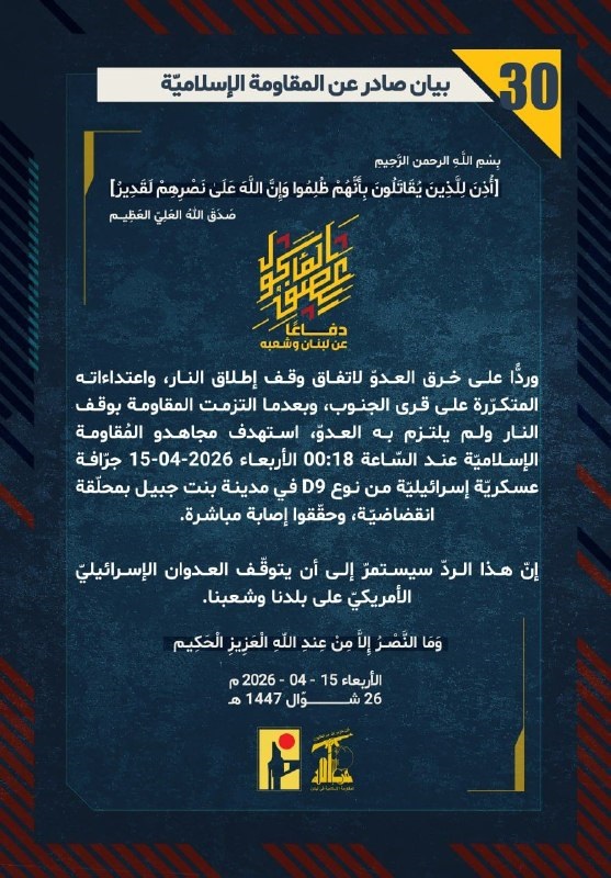 المقاومة الإسلامية بيان رقم (30): استهدفنا بمحلّقة انقضاضيّة جرّافة عسكرية "إسرائيلية" من نوع "D9" في مدينة بنت جبيل جنوب لبنان وحقّقنا إصابة مباشرة