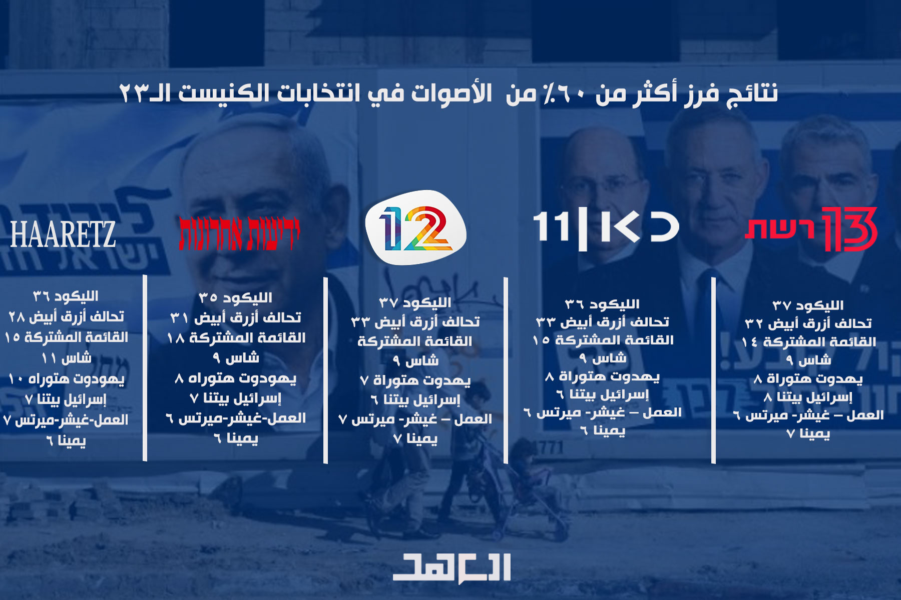وفيما يلي النتائج التي نشرها موقعا صحيفتي "هآرتس" و"يديعوت أحرنوت" والقنوات 11 و12 و13.