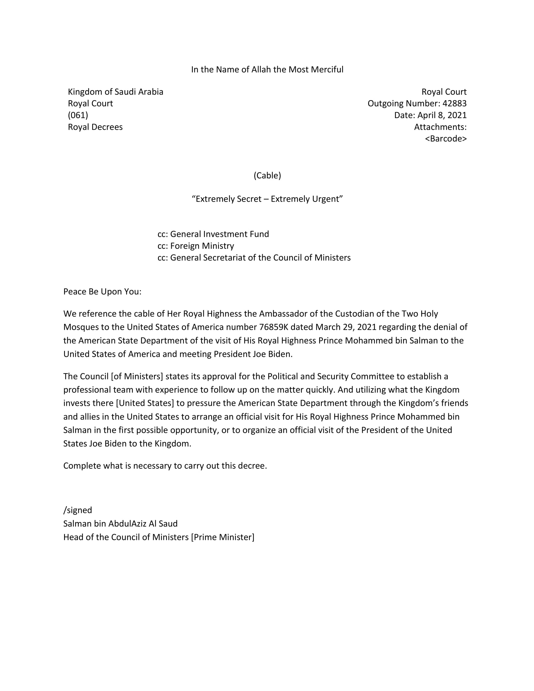 البرقية الموقعة من قبل الملك السعودي سلمان بن عبد العزيز أرسلت في 8 نيسان/أبريل الماضي، وتشير الى رسالة كانت قد بعثت بتاريخ 29 آذار/مارس من السفيرة السعودية في واشنطن ريما بنت بندر تتضمّن رفض وزارة الخارجية الأمريكية زيارة ابن سلمان ومقابلة بايدن.