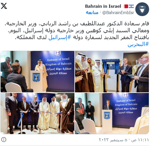ونشرت صفحة السفارة صورًا من افتتاح المقر الجديد، فيما وقّع الوزيران "مذكرة تفاهم للتعاون المشترك في مجال الثقافة على أساس الإنصاف والمعاملة بالمثل والمنفعة المتبادلة"، وفق مزاعم سفارة المنامة في تل أبيب.