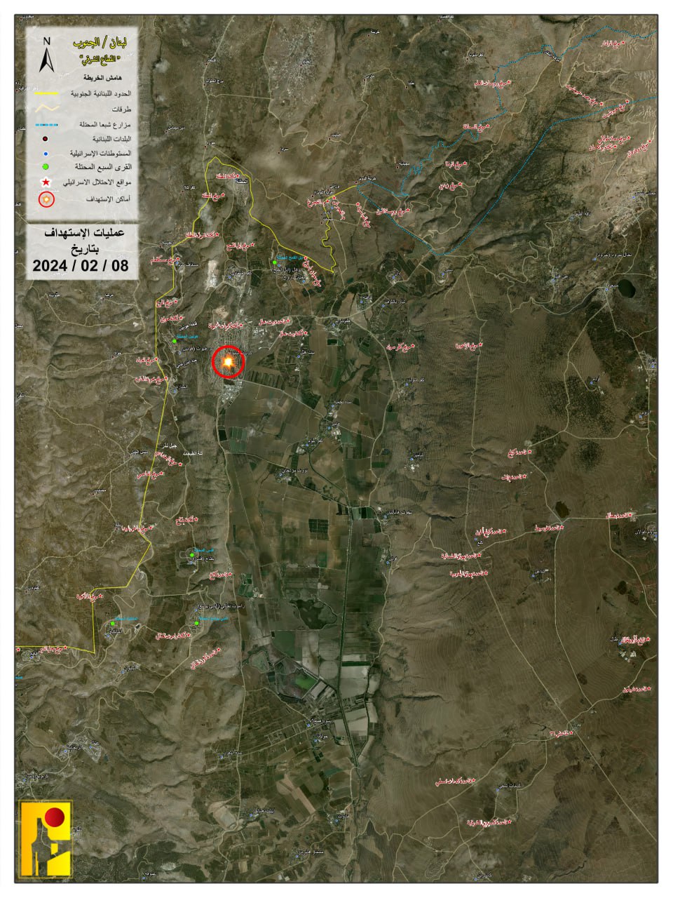 دعمًا لشعبنا الفلسطيني الصامد في قطاع غزة وإسنادًا لمقاومته الباسلة والشريفة، استهدف سلاح المدفعية في المقاومة الإسلامية عند الساعة 01:40 من بعد ظهر يوم الخميس 08-02-2024 موقع الرادار في مزارع شبعا اللبنانية المحتلة وتم تحقيق إصابات مباشرة.