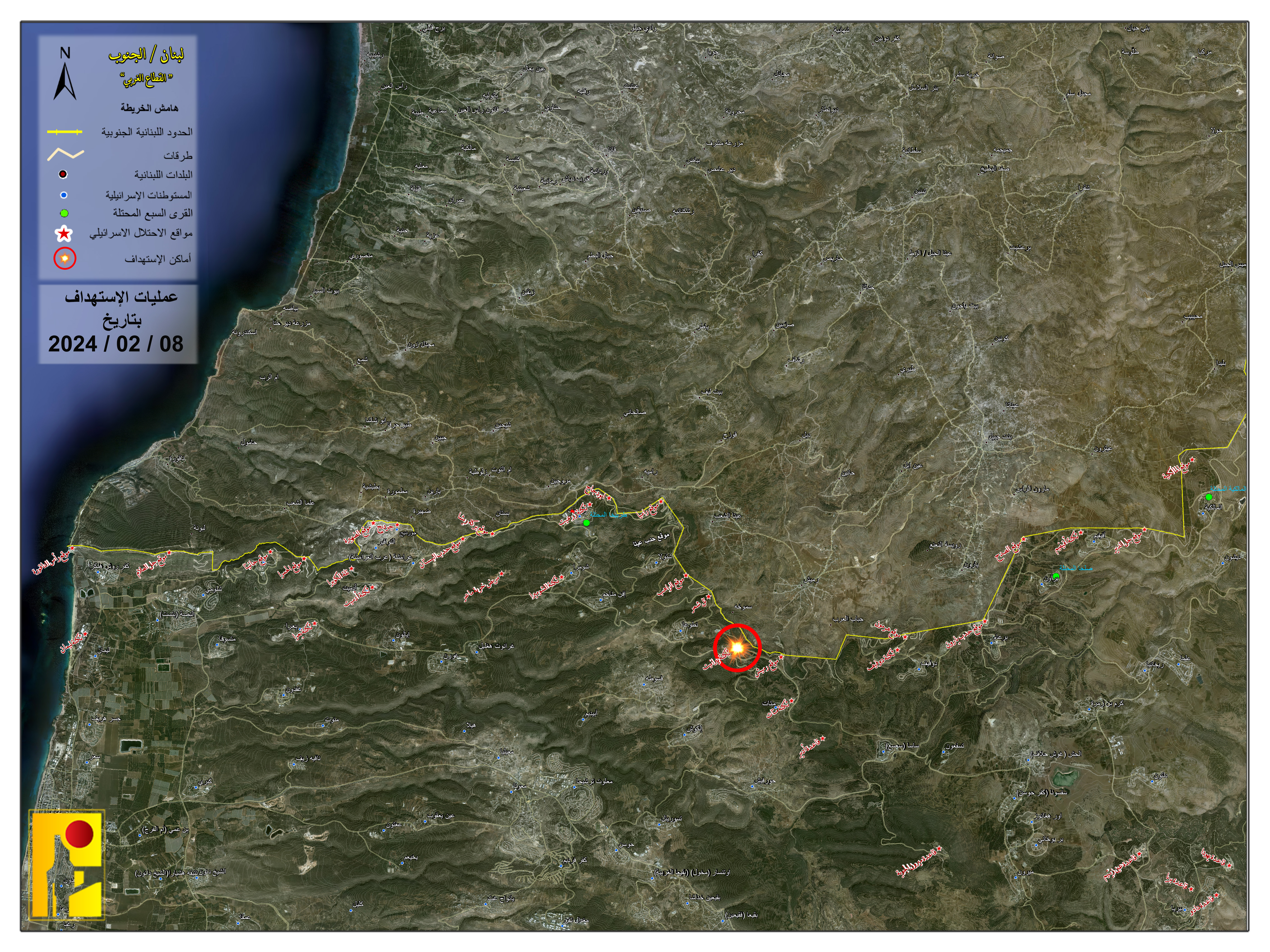 وقبيسل منتصف الليل، أعلنت المقاومة الإسلامية أنه دعماً لشعبنا الفلسطيني الصامد في قطاع غزة وإسناداً لمقاومته الباسلة والشريفة، ورداً على استهداف القرى وخاصةً الاعتداء الأخير على مدينة النبطية استهدف مجاهدو المقاومة الإسلامية عند الساعة (11:00) من مساء يوم الخميس 8-2-2024 مقر قيادة لواء المشاة الثاني في قاعدة عين زيتيم بعشرات من صواريخ الكاتيوشا.