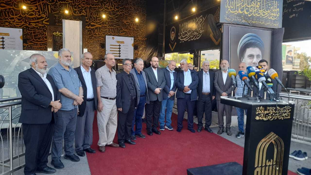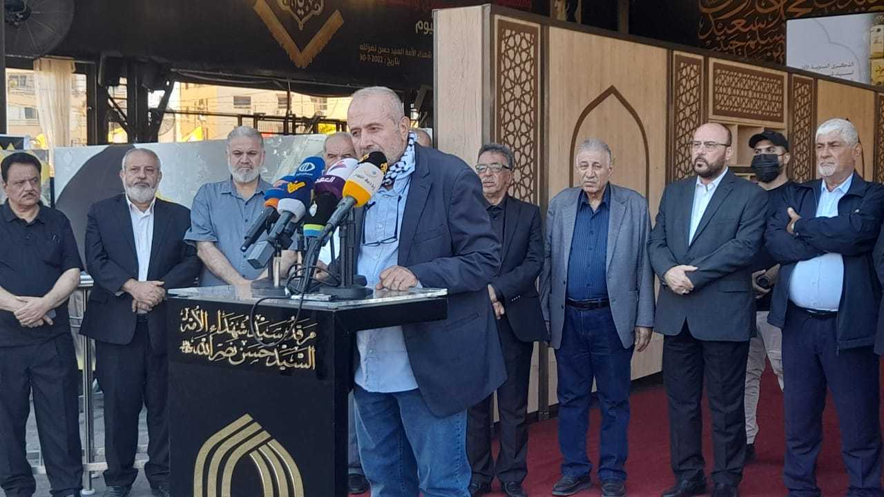 كلمة الوفد القيادي لمسؤولي قوى التحالف الوطني الفلسطيني تلاها ممثل حركة حماس في لبنان أحمد عبد الهادي قال فيها: جئنا اليوم لنعبّر عن الوفاء الخالص لرجل وشخصية عظيمة استشنائية سماحة السيد حسن نصرالله والى جميع اخوانه من الشهداء والقادة وممن قدموا ارواحهم من أجل فلسطين وقضيتها وعلى طريق القدس، كما جئنا لنؤكد اننا مستمرون على ذات الطريق، وماضون على النهج الذي قضى الشهيد الاسمى كل حياته مجاهداً وعالماً من أجل فلسطين ومواجهة المشروع الاميركي الصهيوني في منطقتنا، وباقون على عهد فلسطين وتحريرها وعودة كل للاجئين اليها، وأضاف: "نؤكد ذلك برغم الهجمة الاميركية الصهيونية الخطيرة الاجرامية الارهابية التي تُشن على قوى المقاومة وشعوبها في هذه المنطقة في ظل حرص منهمٍ على المضي قدماً وبأسرع وقتٍ لتنفيذ مشروعهم _مشروع الشرق الاوسط الجديد- الذي يراد من خلاله إقامة دولة "اسرائيل" الكبرى ضمن ما تسمى اتفاقات ابراهام، وكلُّ ذلك على حساب القضية الفلسطينة التي يسعون كل يوم لتصفيتها نهائياً".
