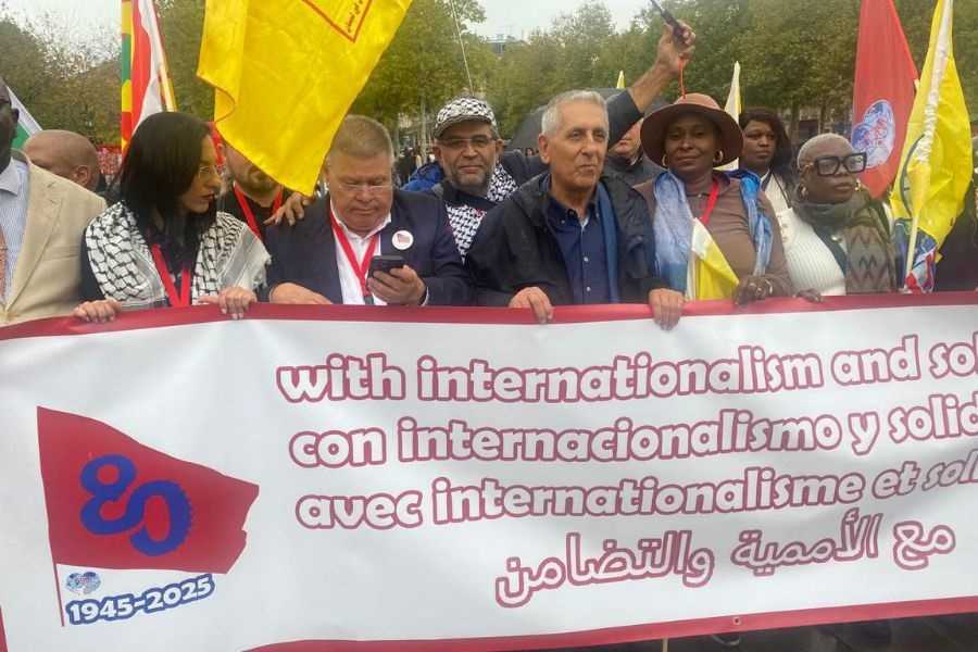 شهدت "ساحة الجمهورية" في باريس مظاهرة حاشدة تضامنًا مع الشعب الفلسطيني، نظّمها "اتحاد النقابات العالمي" (WFTU) في الذكرى الـ80 لتأسيسه، بمشاركة رئيسه، رئيس "اتحاد نقابات العمال والمستخدمين في لبنان" علي طاهر ياسين، وممثّلين عن أكثر من 140 منظمة نقابية من 60 دولة.