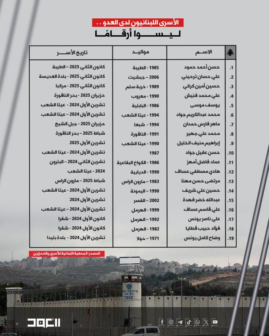 تحت عنوان "أسرانا المنسيّون"، أطلقت الجمعية اللبنانية للأسرى والمُحرّرين حملة إعلامية هدفها تذكير من يهمّه الأمر بـ19 أسيرًا لبنانيًا يقبعون في سجون العدو، حتّى الآن لم يُعرف مصيرهم، ولم تعمل الدولة على مُلاحقة ملفّهم.