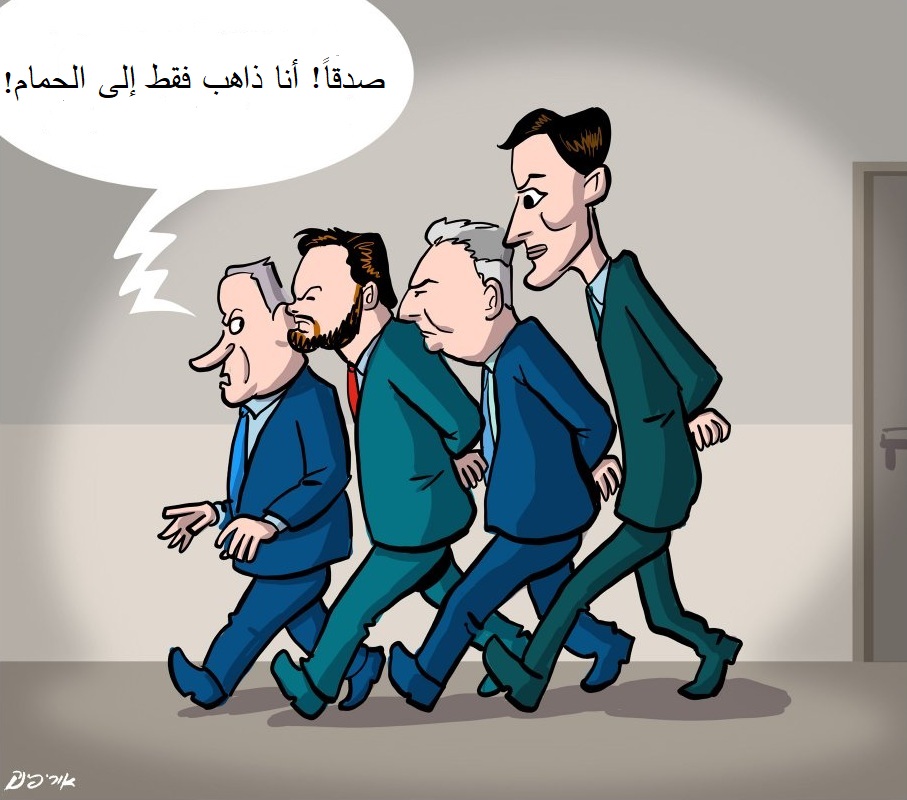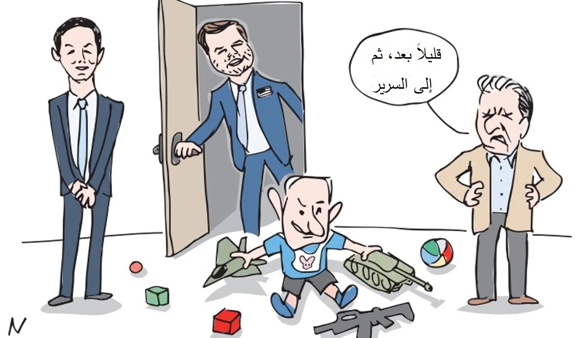 يظهر الرسم في كاريكاتور صحيفتي "هآرتس" و"معاريف" مدى التدخّل والتحكّم الأميركي عبر جيه دي فانس، نائب الرئيس الأمريكي دونالد ترامب الذي يزور الاراضي المحتلة حاليًا برئيس حكومة الاحتلال بنيامين نتنياهو والمراقبة الدائمة لكل خطوة يقوم بها والسيطرة عليه.