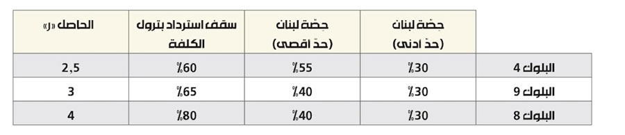 أمّا بخصوص الشروط التجاريّة، فيبدو أنّ الأمور في مسار انحداري لغير صالح لبنان. فشروط البلوك 9 أسوأ من شروط البلوك 4، وشروط البلوك 8 أسوأ بكثير من شروط البلوك 9 كما يوضّح الجدول المُرفق. فكلّما انخفضت حصّة لبنان القصوى، وارتفع سقف استرداد بترول الكلفة، والحاصل «ر»، كان الأمر أسوأ بالنسبة إلى لبنان.