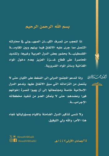 كما دعا الشيخ الخليلي، في منشور على منصة "أكس"، الدول الإسلامية ومجتمعاتها إلى، أنْ "يهبّوا لنصرة إخوانهم فورًا، حتى لا يتمكّن العدو من تنفيذ مخططاته الإجرامية".