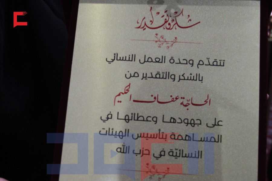 بعد ذلك جرى تكريم مسؤولة وحدة الهيئات النسائيّة السابقة الحاجة عفاف الحكيم ممثّلةً بأختها الحاجة زينب الحكيم وتم تقديم درع تكريمي لها؛ تقديرًا لجهودها الكبيرة منذ بدايات العمل الإسلامي في لبنان.