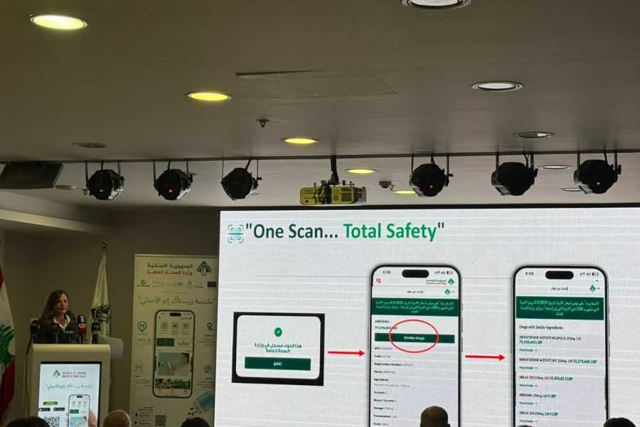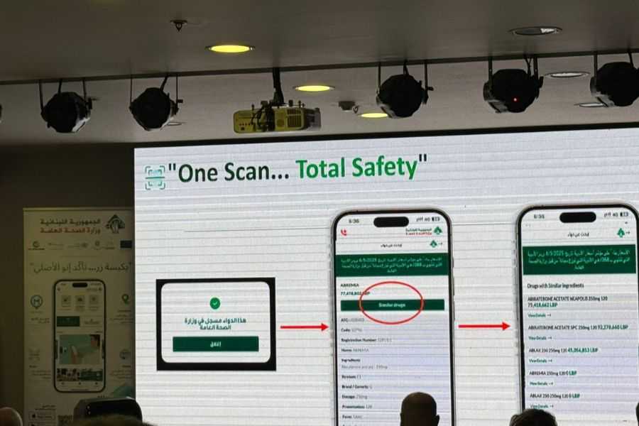 وأكد ناصر الدين أن التطبيق يتضمن ميزة جديدة تتيح التحقق من أصالة الدواء، بما يحد من استخدام الأدوية المزورة والمزيّفة التي قد تشكل خطرًا على الصحة العامة، ويتم ذلك من خلال فحص الرقم الخاص بالعلبة من خلال الهاتف، فاذا ما أعطط اشارة "صح" يكون الدواء قد تم فحصه عبر الوزارة.
