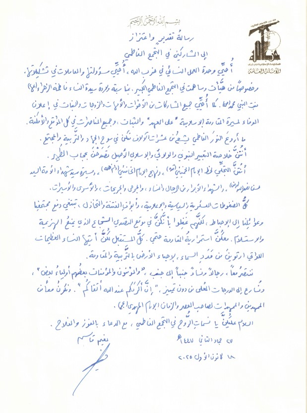 كم حيا سماحته جميع المشاركات، من الأخوات والأمهات والزوجات والبنات، في إعلان الوفاء لمسيرة المقاومة الإسلامية "على العهد" والثبات وجميع المناصرات في المواقع والأمكنة كلها.