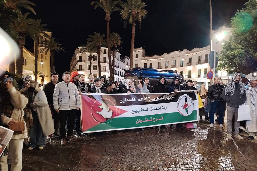 وفي تطوان رفع المشاركون الشعارات نفسها خلال الوقفة الاحتجاجية بساحة مولاي المهدي. وقد شهدت هذه الوقفة حضورًا وازنًا ومتنوعًا لسكان المدينة التي صدحت بصرخات استنكار ضدّ "تطبيع الذل والعار"، وندّدت بالجرائم الهمجية التي يرتكبها مجرم الحرب "نتنياهو" وحكومته النازية. ودعا ممثل الجبهة في كلمته إلى إسقاط كافة أشكال التطبيع وردع العدوان عن غزّة.