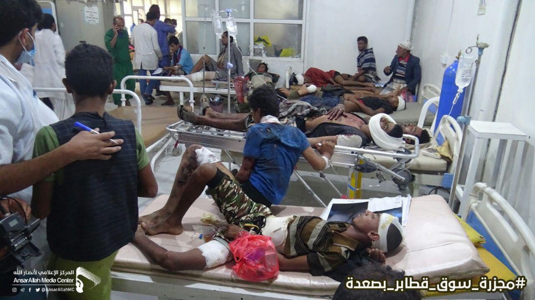 وأفادت قناة "المسيرة" أن قصفًا سعوديًا استهدف سوق آل ثابت بمديرية قطابر الحدودية نتج عنه استشهاد 13 مواطنًا بينهم طفلان و23 جريحًا بينهم 11 طفلاً في حصيلة غير نهائية.
