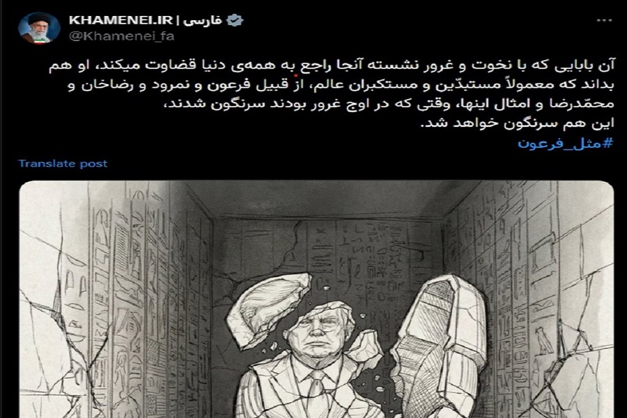 وجاء في التغريدة بالفارسية تعليقًا على الصورة: "ذلك الأب الذي يجلس هناك متكبرًا مغرورًا، ويحكم على العالم كله، عليه أن يعلم هو أيضًا أن المستبدين والمتغطرسين في العالم، هم مثل فرعون ونمرود، ورضا خان ومحمد رضا، وأمثالهم، عادة ما سقطوا عندما كانوا في قمة غرورهم، وهذا (ترامب) أيضًا سيسقط، مثل فرعون".