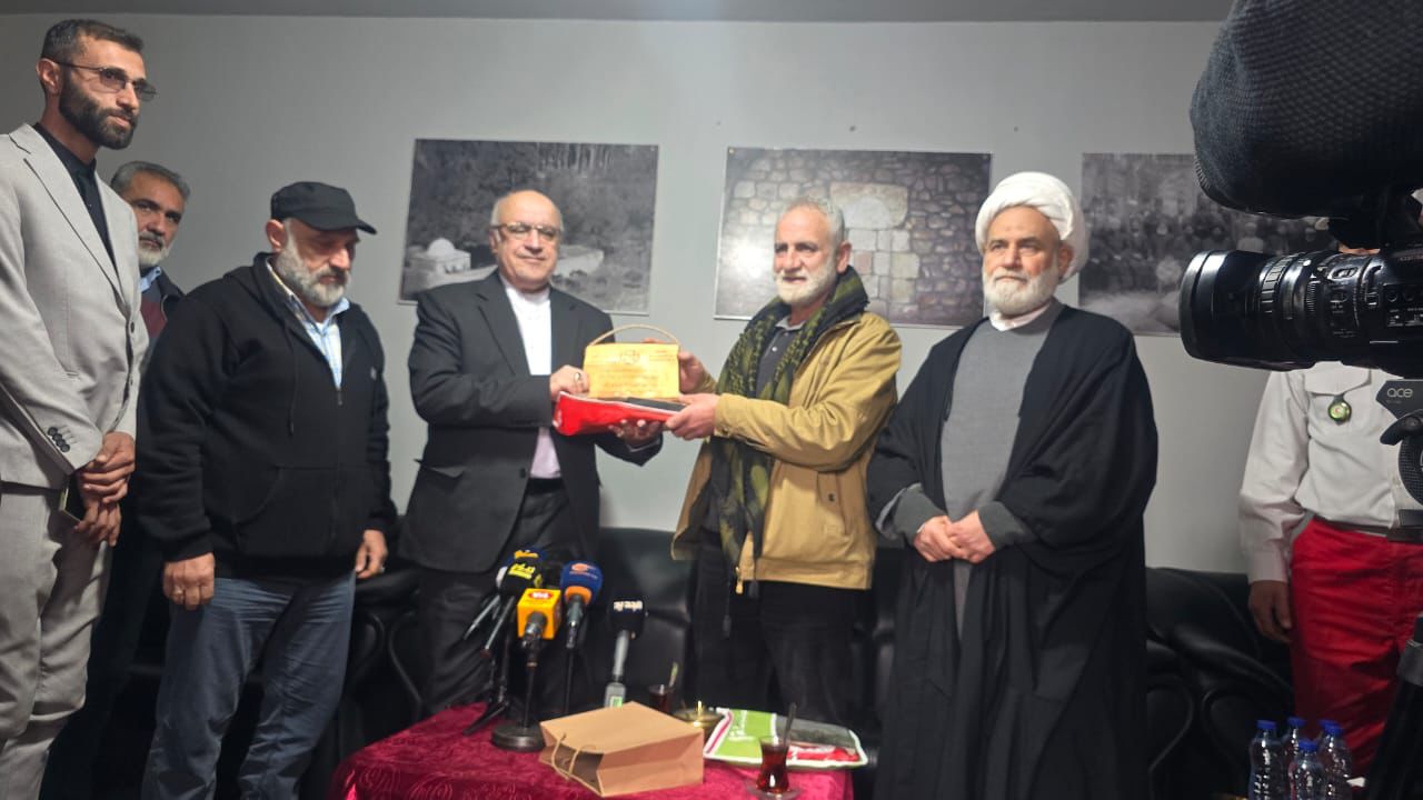 وفي ختام الزيارة، قدّم نصر الله للسفير مجتبى أماني درعًا تقديريًا وكتابًا تاريخيًا يشرح رحلة السبايا وراية السيدة خولة.