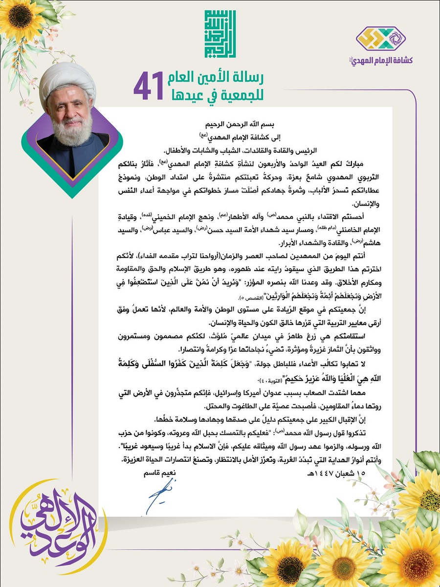وجّه الأمين العام لحزب الله سماحة الشيخ نعيم قاسم رسالة معايدة لجمعية كشافة الإمام المهدي (عج) في عيدها الواحد والأربعين، خاطب فيها الكشفيين والكشفيات قائلًا: "مهما اشتدت الصعاب بسبب عدوان أميركا و"إسرائيل"، فإئكم متجذرون في الأرض التي روتها دماء المقاومين.