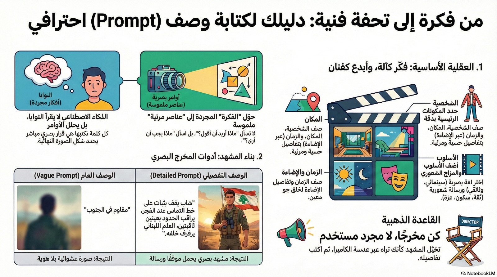 ثانيًا لا بد من وصف تفاصيل المشهد. فالوصف العام مثل: "مقاوم في الجنوب"، يُنتج صورة بلا زمن، ولا رسالة، ولا هوية. ولذلك لا بد من الوصف الدقيق والتفصيلي للمشهد مثال: "شاب مقاوم يقف بثبات على خط التماس عند الفجر، يراقب الحدود بعينين ثاقبتين، العلم اللبناني يرفرف خلفه، والشمس تشرق من خلف جبال الجنوب"، وهذه كانت النتيجة عبر نموذج Gemini :