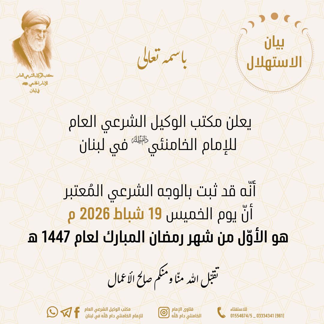 أعلن مكتب الوكيل الشرعي العام لآية الله العظمى الإمام السيد علي الخامنئي في لبنان أنّ غدًا الخميس هو أول أيام شهر رمضان المبارك.