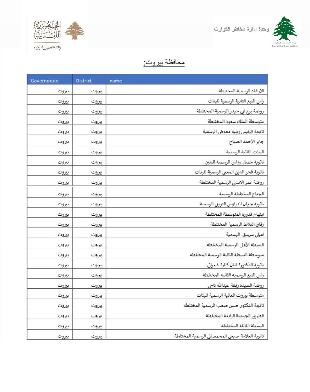 عممت رئاسة مجلس الوزراء اللبناني صباح الاثنين اليوم الإثنين 2 آذار/مارس 2026 أسماء المدارس الجاهزة لاستقبال الأهالي في بيروت والمناطق، وذلك بعد الاعتداءات الصهيونية التي نفذها العدو على عدة مناطق في جنوب لبنان والضاحية الجنوبية لبيروت.