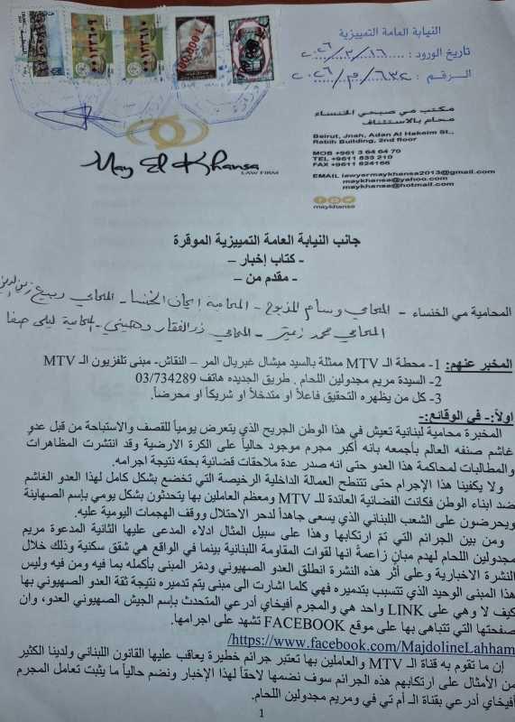 إخبار إلى النيابة العامة التمييزية ضد MTV والعاملين فيها