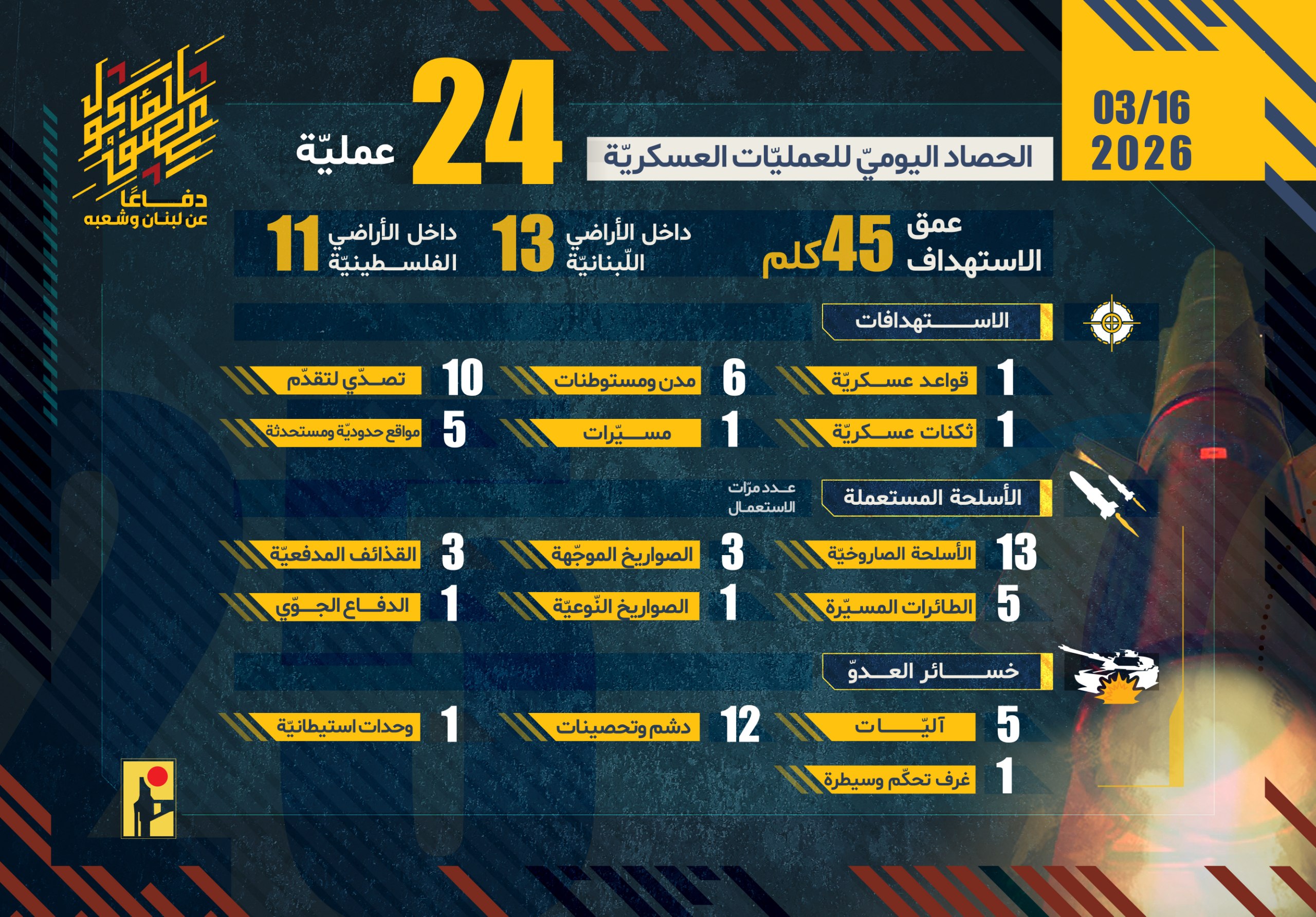 الحصاد اليومي لعمليات المقاومة الإسلامية بتاريخ 16-03-2026