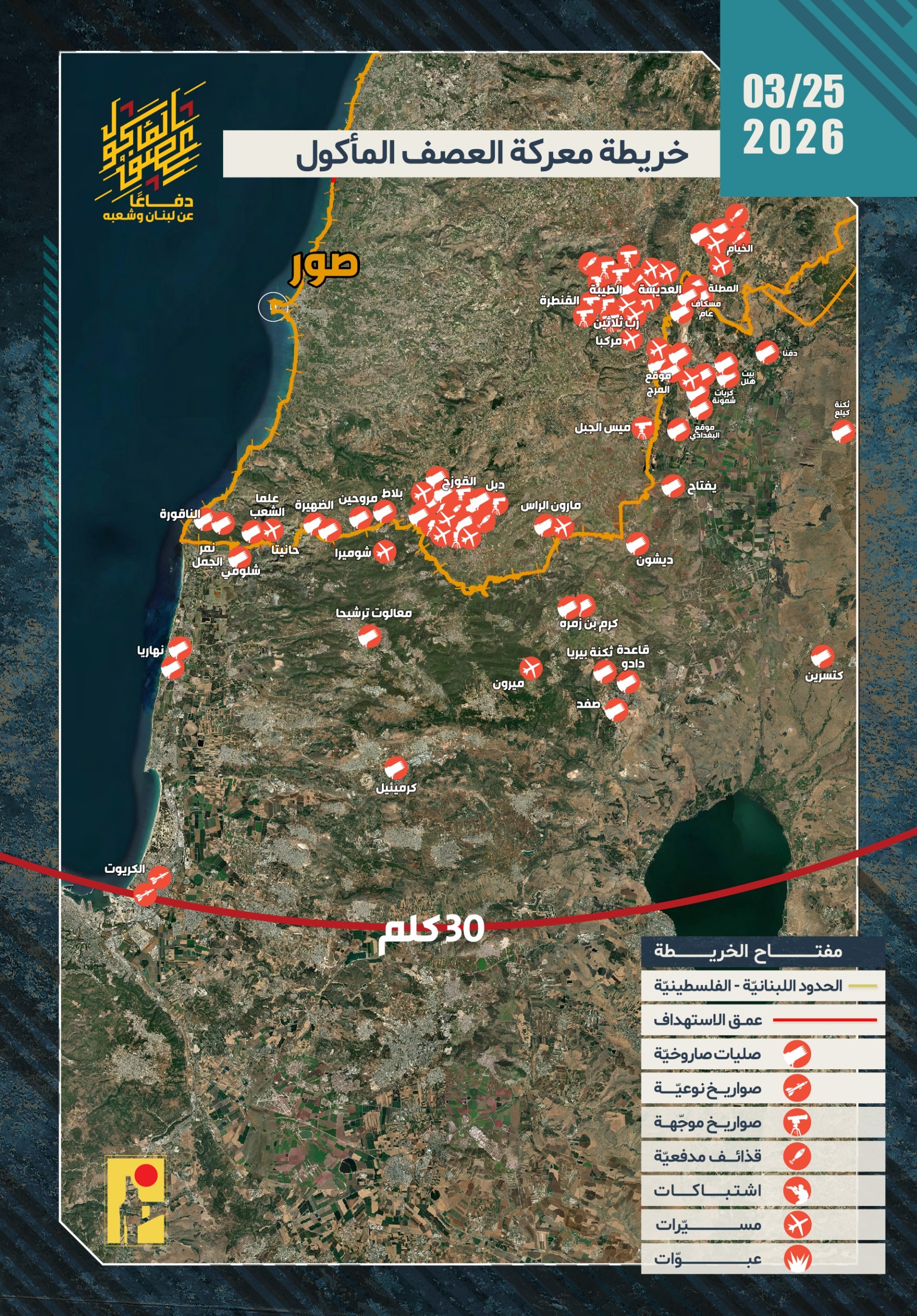 دفاعًا عن لبنان وشعبه، أصدرت المقاومة الإسلامية بتاريخ الأربعاء 25/03/2026، 87 بيانًا عسكريًا حول عمليات التصدي لتحركات العدو الإسرائيلي عند الحدود اللبنانية الفلسطينية، وكذلك عمليات استهداف مواقع وقواعد وانتشار جيش العدو الإسرائيلي ومستوطناته في شمال فلسطين المحتلة، وفقًا للآتي: