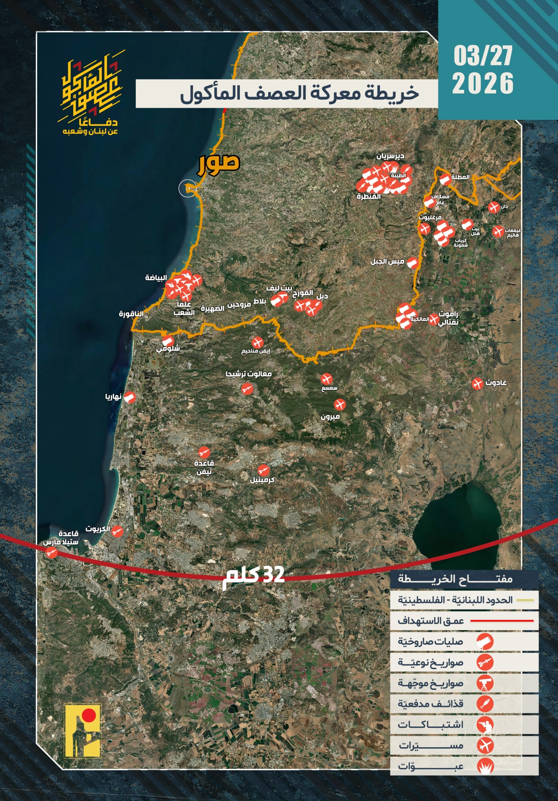 دفاعًا عن لبنان وشعبه، أصدرت المقاومة الإسلامية بتاريخ الجمعة 27/03/2026، 58 بيانًا عسكريًا حول عمليات التصدي لتحركات العدو "الإسرائيلي" عند الحدود اللبنانية الفلسطينية، وكذلك عمليات استهداف مواقع وقواعد وانتشار جيش العدو ومستوطناته في شمال فلسطين المحتلة، وفقًا للآتي: