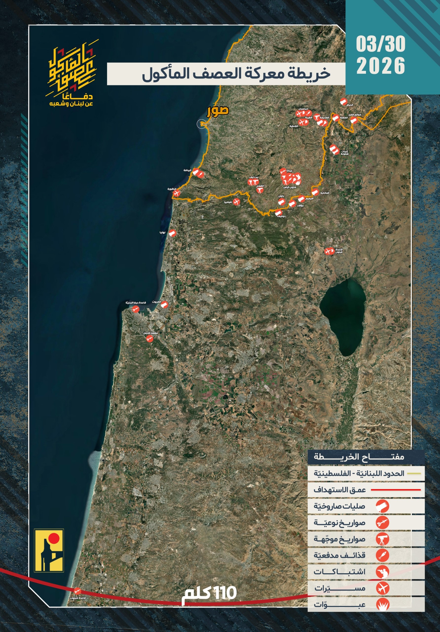 دفاعًا عن لبنان وشعبه، أصدرت المقاومة الإسلامية بتاريخ الإثنين 30/03/2026، 40 بيانًا عسكريًا حول عمليات التصدي لتحركات العدو الإسرائيلي عند الحدود اللبنانية الفلسطينية، وكذلك عمليات استهداف مواقع وقواعد وانتشار جيش العدو الإسرائيلي ومستوطناته في شمال فلسطين المحتلة، وفقًا للآتي:
