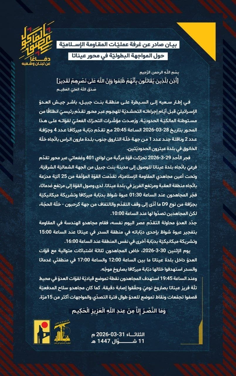 يوم الاثنين 30-3-2026، خاض المجاهدون ثلاثة اشتباكات متوالية مع قوّات العدوّ داخل بلدة عيناثا ما بين الساعة 12:00 والساعة 17:00 في منطقتَي غدماثا والسدر استهدفوا خلالها دبّابة ميركافا بصاروخ موجّه.