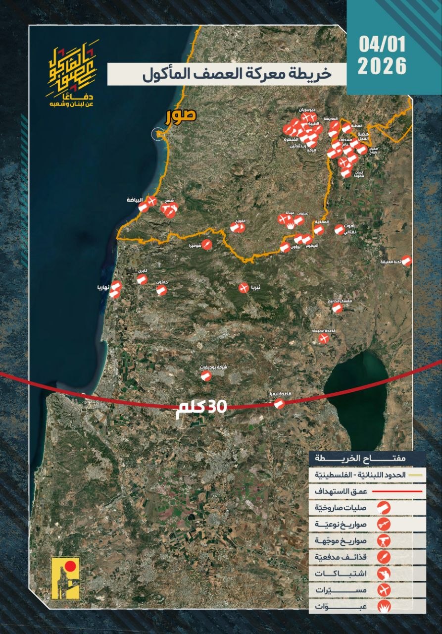دفاعًا عن لبنان وشعبه، أصدرت المقاومة الإسلامية بتاريخ الأربعاء 01/04/2026، 60 بيانًا عسكريًا حول عمليات التصدي لتحركات العدو الإسرائيلي عند الحدود اللبنانية الفلسطينية، وكذلك عمليات استهداف مواقع وقواعد وانتشار جيش العدو الإسرائيلي ومستوطناته في شمال فلسطين المحتلة، وفقًا للآتي: