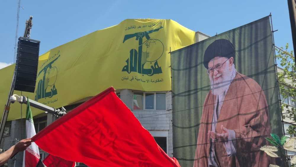 كذلك وضع الحشود راية المقاومة الإسلامية أمام مكان استشهاد الإمام الخامنئي.