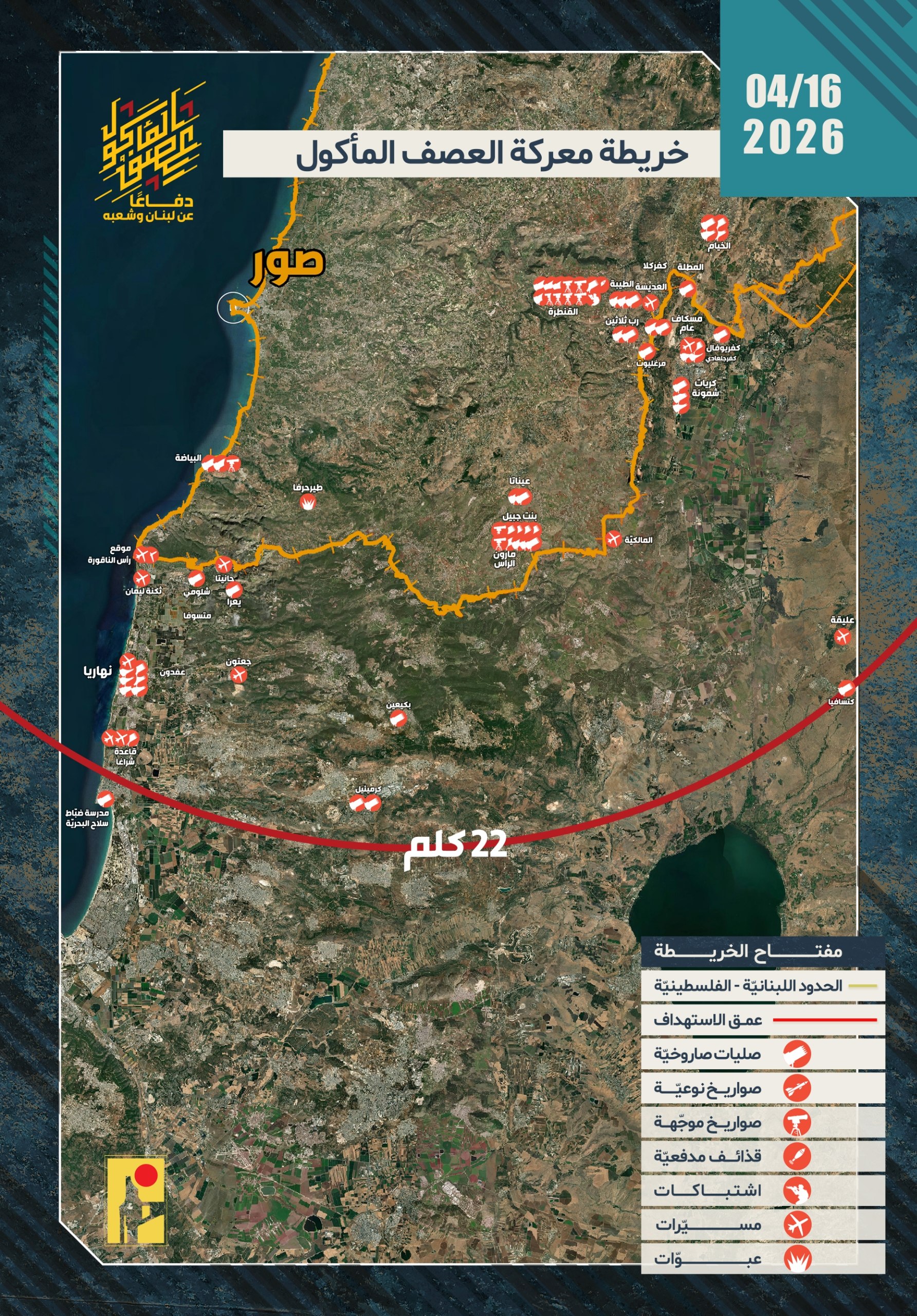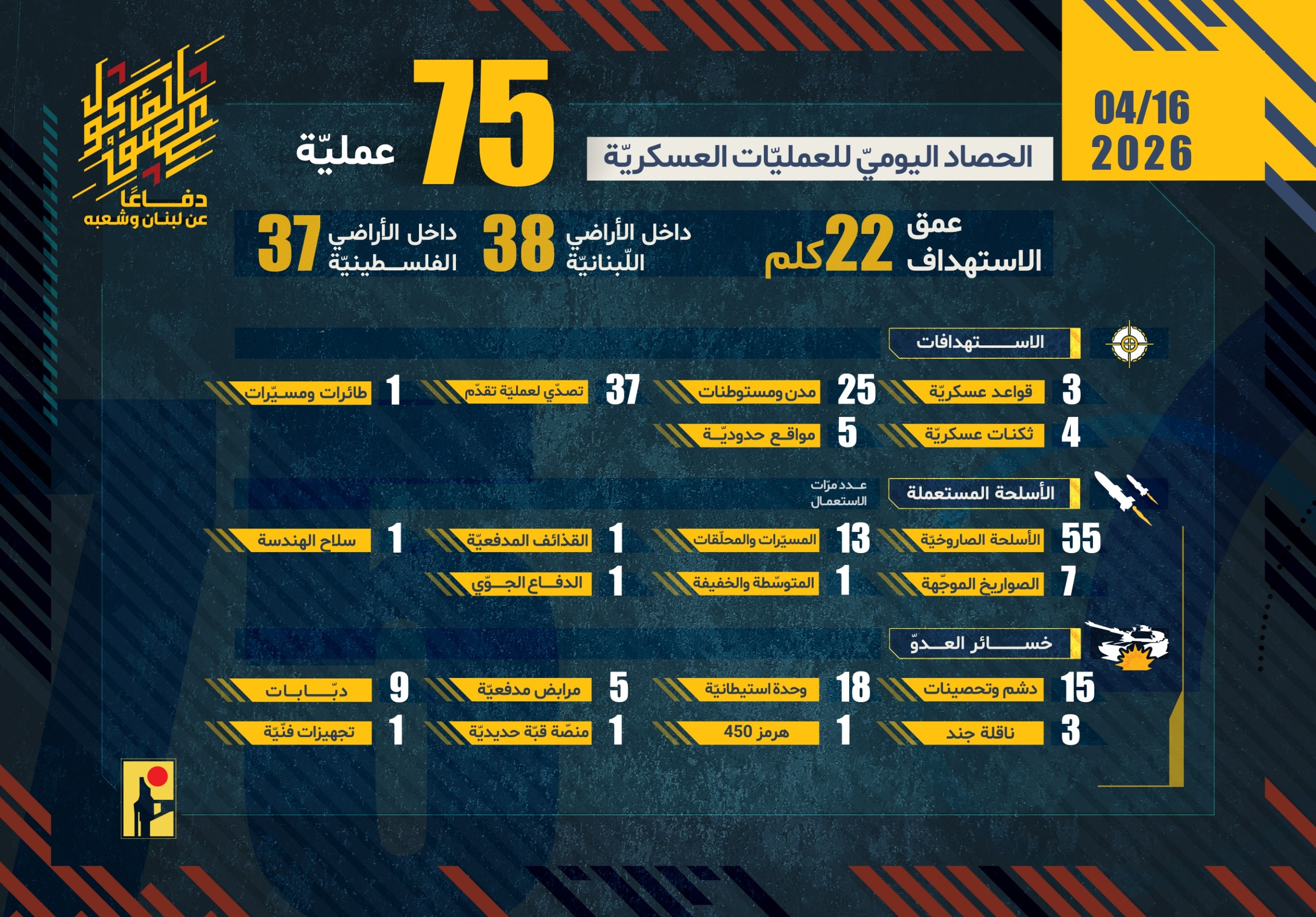 دفاعًا عن لبنان وشعبه، ردًّا على خرق العدوّ لاتفاق وقف إطلاق النار، واعتداءاته المتكرّرة على قرى الجنوب، وبعدما التزمت المقاومة بوقف النار ولم يلتزم به العدوّ، أصدرت المقاومة الإسلامية بتاريخ الخميس 16/04/2026، 56 بيانًا عسكريًا حول عمليات التصدي لتحركات العدو الإسرائيلي عند الحدود اللبنانية الفلسطينية، وكذلك عمليات استهداف مواقع وقواعد وانتشار جيش العدو الإسرائيلي ومستوطناته في شمال فلسطين المحتلة، وفقًا للآتي: