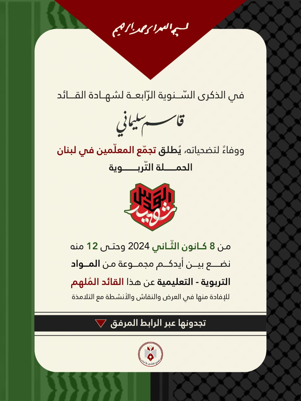 في الذكرى السنوية الرابعة لشهادة القائد قاسم سليماني، ووفاءً لتضحياته، أطلق تجمع المعلمين في لبنان الحملة التربوية "شهيد القدس"، من 8 كانون الثاني/يناير 2024 وحتى 12 منه، ووضعت بين أيدي الراغبين مجموعة من المواد التربوية - التعليمية عن هذا القائد المُلهم للإفادة منها في العرض والنقاش والأنشطة مع التلامذة.