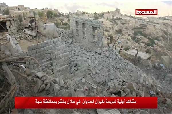 ارتكب طيران العدوان السعودي على اليمن مجزرة جديدة مروعة مساء اليوم باستهدافه منازل مواطنين عزل في محافظة حجة استشهد فيها 20 امرأة وطفل.